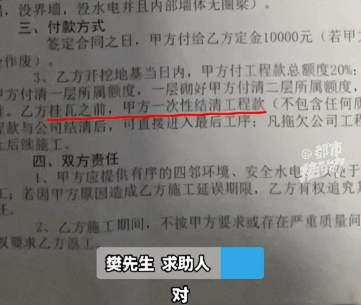 除此之外,双方在尾款金额方面也存在分歧。樊先生计算的数额为256200元,而施工方则认为是257000元。按照合同约定,甲方应在挂瓦前一次性结清工程款。樊先生强调,自己并非故意拖欠尾款:“只要他们把房子修好,我一分都不会少!”